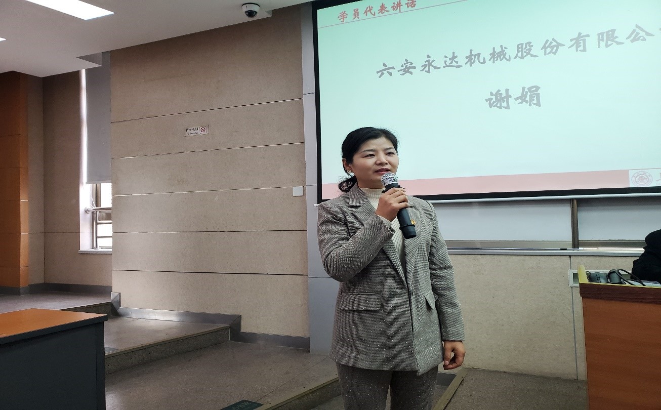 来自六安永达机械股份有限公司的谢娟同学作为新生代表上台进行发言。她表示十分珍惜此次学习机会,对领导和老师表示真诚的感谢,希望能和大家一起学习,一起进步。