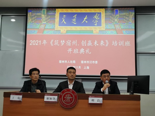 11月1日,《筑梦宿州.创赢未来》创业特训营(第一期)开班典礼在冰球突破mg正规官网长宁校区举行。安徽省宿州市团市委书记谢颖锋、冰球突破mg正规官网院长胡洁、宿州市就业管理中心副主任丁蕾、宿州市团市委四级调研员、青少年发展和权益维护部部长周心成、宿州市就业管理中心办公室主任席从文等出席开班典礼。来自宿州市人社局、共青团宿州市委的35名青年创业者参加了此次培训。
