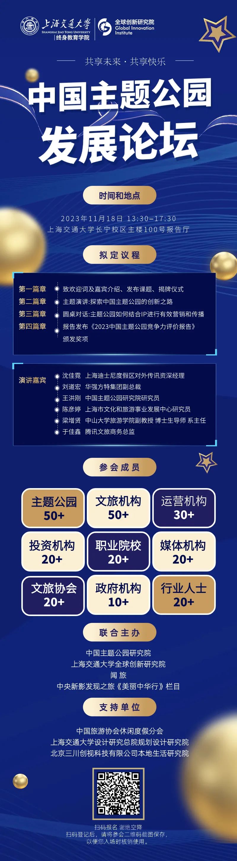 我们将汇聚来自国内外各地的专家、学者、企业家和投资人,共同到场参与,从理论研究报告到行业标杆案例的分享交流,为文旅与主题公园行业人士提供一个倾听与沟通的机会,以促进跨界合作,激发创新思维,共同推动中国主题公园领域的繁荣与进步,为与会者敞开一扇通向广阔知识与视野的大门。